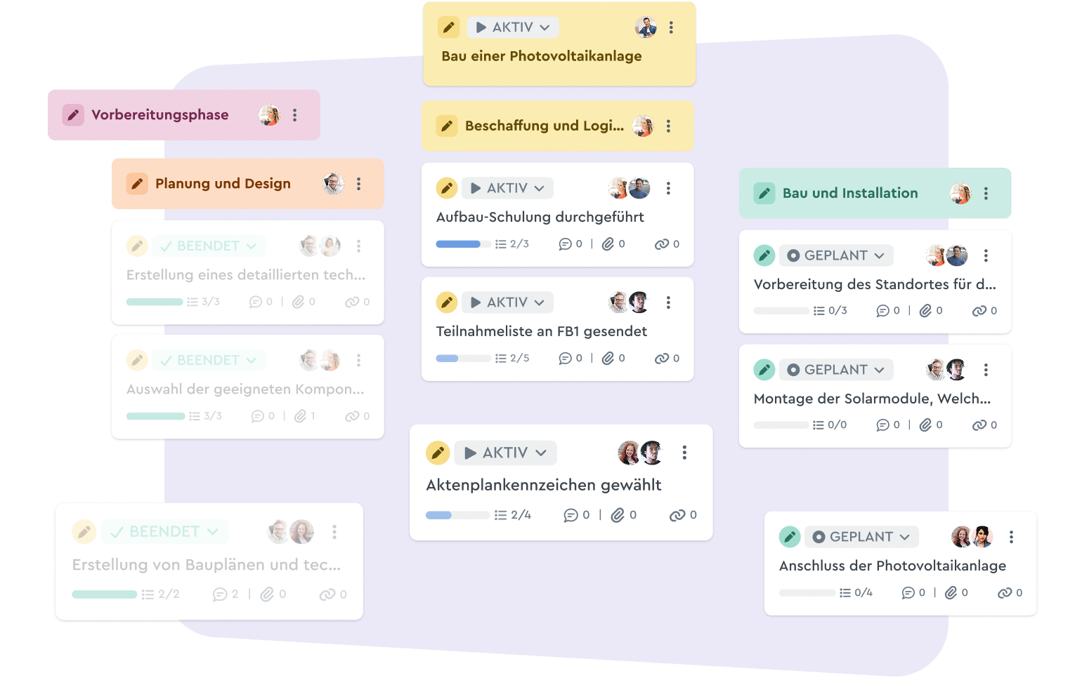 Alle sehen auf einen Blick, was zu tun ist, wer beteiligt ist und wie euer Projekt aufgebaut ist – vom ersten Entwurf bis zum fertigen Ergebnis.